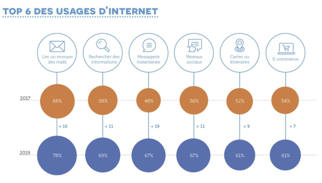 - Même si les Seniors rattrapent leur retard, il y a « seulement » 64% de connectés parmi les 70 ans et +.