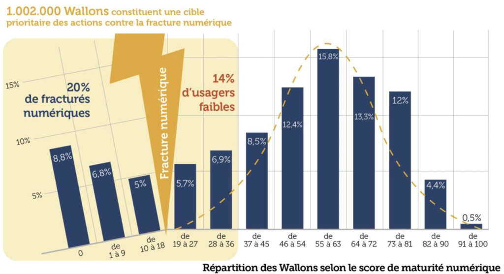 « L’indicateur de maturité numérique intégrant le sentiment de compétence et la diversité des usages Internet montre que 20% de la population de 15 ans et plus est clairement en situation de fracture numérique. 14% des Wallons n’ont qu’une maturité restreinte qui les met en situation d’usagers faibles dans la société numérique actuelle. »